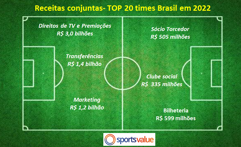 Os TOP 20 clubes viram as receitas cresceram 9% em 2022 atingindo pela primeira vez R$ 7,5 bilhões. Principais impactos foram os recursos com bilheteria que alcançaram R$ 600 milhões, frente aos R$ 149 milhões de 2021.