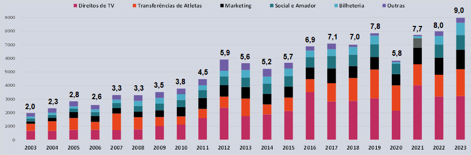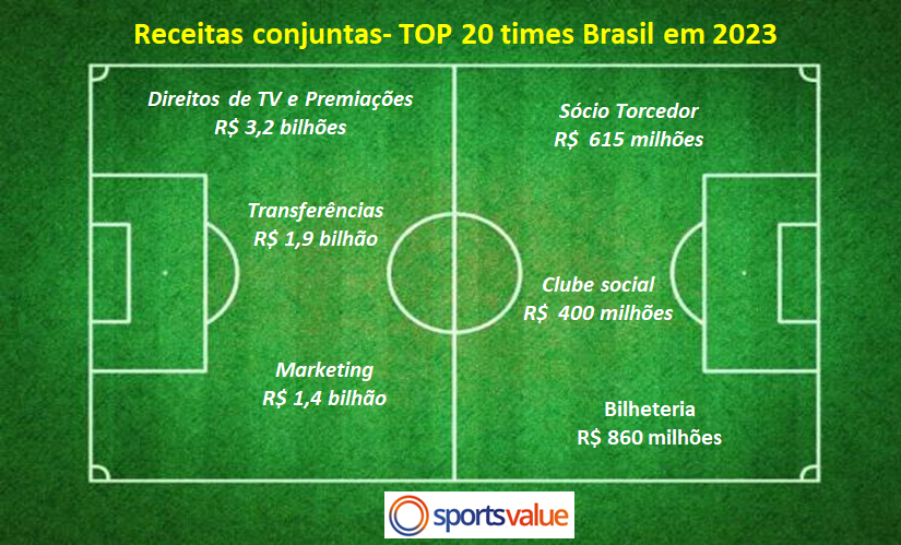 Clubes brasileiros atingiram a maior receita conjunta da história R$ 9 bi em 2023, aumento foi de 20%. Considerando o impacto da inflação, crescimento real foi de 12%.