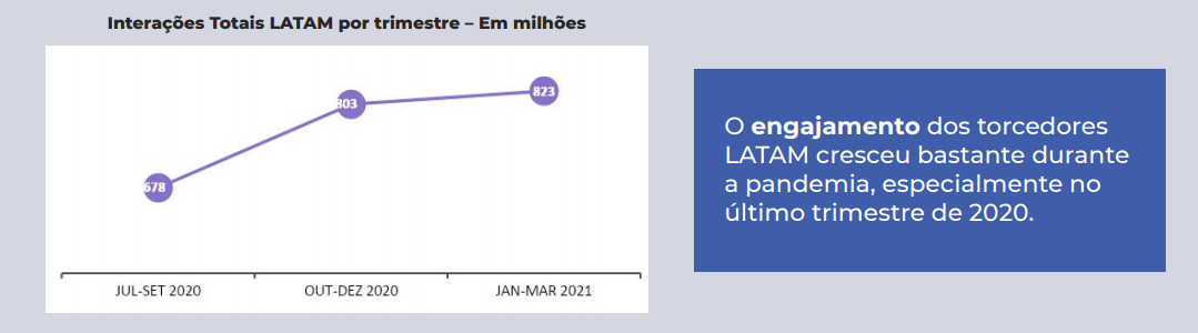 Os clubes LATAM somados têm 310 milhões de fãs nas redes sociais, que produzem por ano 3,1 bi de interações anuais, ou 3,8 bi incluindo os vídeos no YouTube.