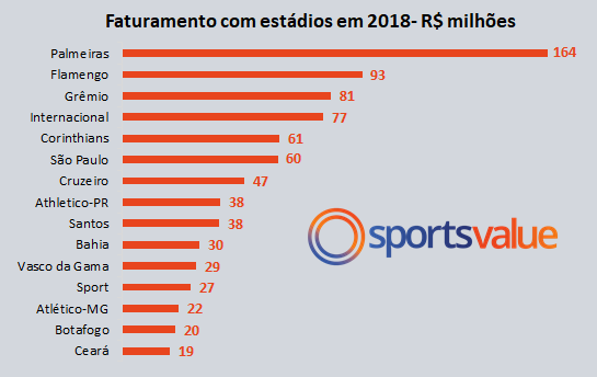 As receitas com estádios geradas pelos clubes brasileiros atingiram o valor recorde de R$ 999 milhões, frente aos R$ 943 milhões de 2017.