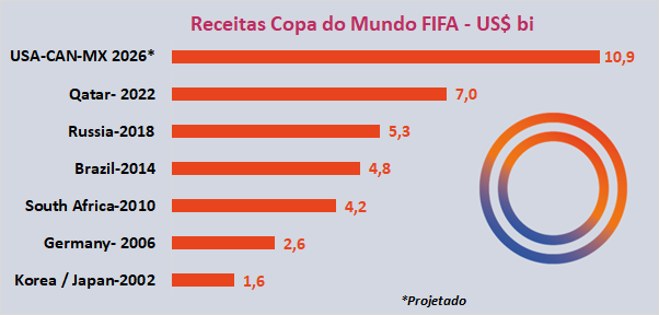 O Mundial, segundo dados analisados pela Sports Value nos Annual Reports da FIFA, projetam uma receita total de US$ 10,9 bi, aumento de 56% em relação à Copa do Mundo de 2022 no Catar, que gerou US$ 7 bi.
