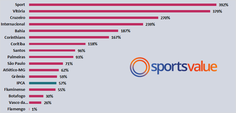 Nos últimos 8 anos as dívidas dos 20 clubes subiram 86% enquanto o IPCA acumulado do período foi de 57%.