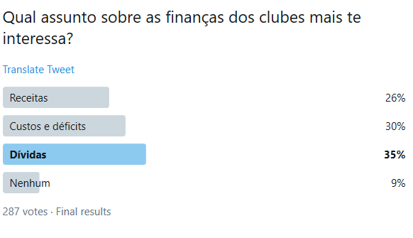 Para 35% das pessoas, o tema que mais interessa são as dívidas dos times. Aqui o resultado: