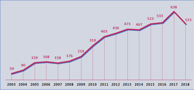 This growth tendency was only interrupted in 2018. Between 2012 and 2018 growth was much more modest and was halted in 2018. And 2017 had been the best performance in recent years.