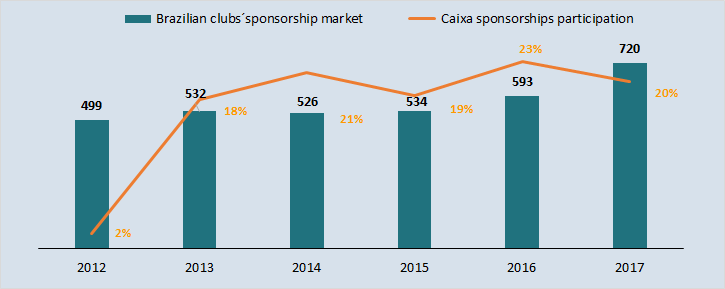 In 2017, the sponsorships market for football clubs in Brazil totaled R$ 720 million, with Caixa investments responsible for R$ 146 million, or 20% of the total.