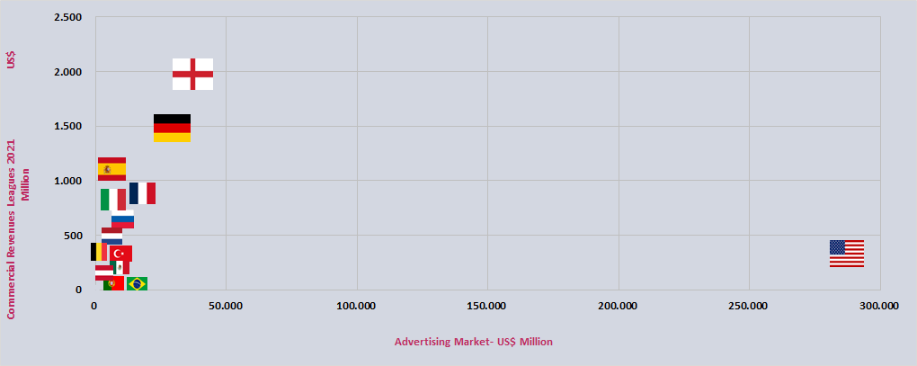 Football Leagues – Commercial revenues X Advertising market size- 2021- US$ Million