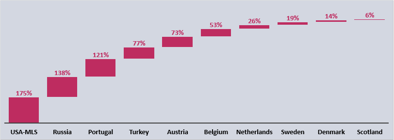 Leagues with the biggest growth in the last decade.