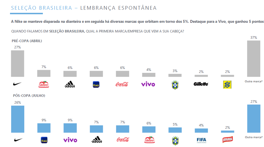 Nike is the brand most remembered as a sponsor of the Brazilian National Team with 27% recognition. The Guaraná second with only 7%, adidas that neither sponsor is with 6%, the same of Itaú and Coca Cola.