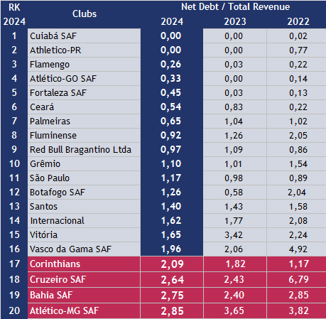 For Sports Value, under a Financial Fair Play regulation, the ratio should not exceed 2.0. The 2024 average of Brazil’s Top 20 clubs was 1.23.