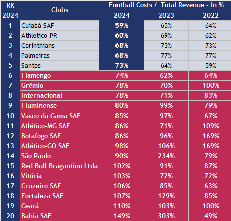 Only Cuiabá SAF, Athletico-PR, Corinthians, Palmeiras, and Santos had ratios at or below 73%. And even with this ratio, some still posted heavy losses, such as Corinthians and Santos.