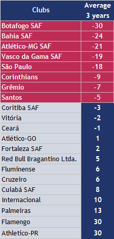 Botafogo SAF, Bahia SAF, Atlético-MG SAF, São Paulo, Vasco da Gama SAF, Corinthians, Grêmio and Santos, show average 3-year deficits above US$ -4 million.