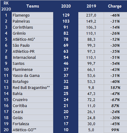 Flamengo remains at the top in revenues terms, even though it is the club that suffered the most in absolute values of revenue cuts.