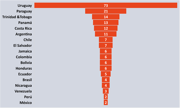 The study has many interesting insights, such as the strength of Uruguay, a giant of 3.5 million inhabitants.
