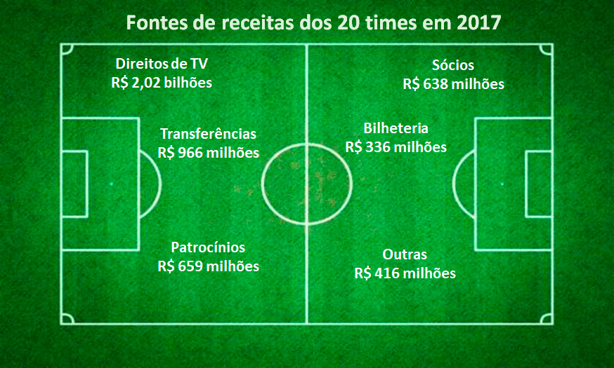 El mercado brasileño de fútbol movió en 2017 un total de R$ 6,25 mil millones en ingresos. Los 20 mayores clubes brasileños son responsables del 81% de este total.