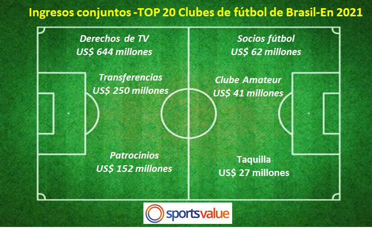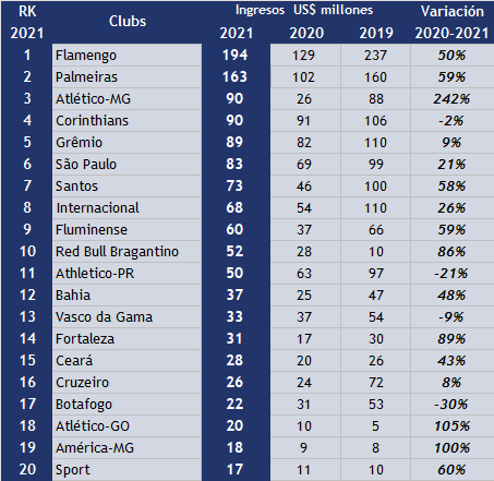 TOP 20 clubes brasleños en Ingresos en 2021- US$ mil millones