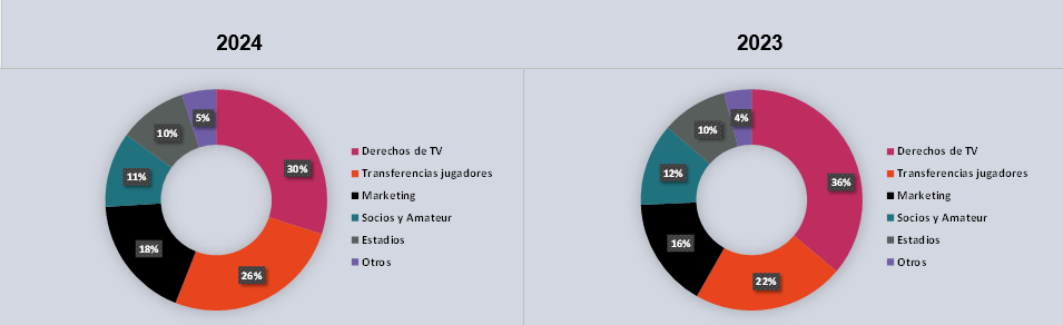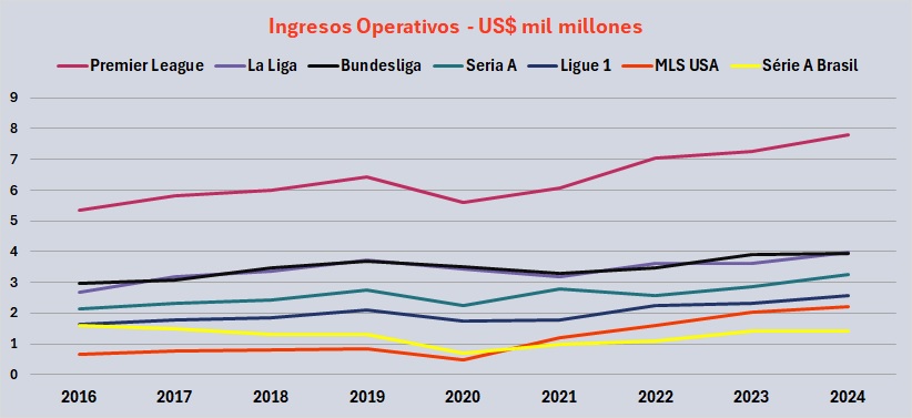 En dólares, los ingresos totales alcanzaron los US$ 1.9 mil millones, y los ingresos operativos (sin transferencias de jugadores) fueron de US$ 1.4 mil millones.