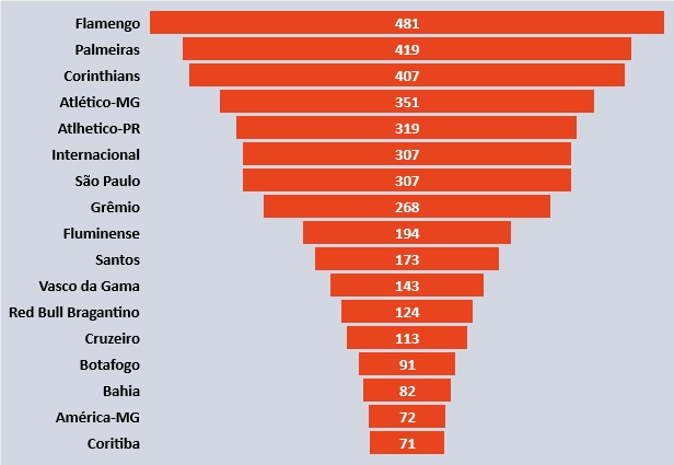 Valuation 2021 R$ Bi@Flamengo 2,7@Palmeiras 2,3@Corinthians 2,3@Atletico 1,9@AthleticoPR 1,8@SCInternacional 1.7 @SaoPauloFC 1,7 @Gremio 1,5