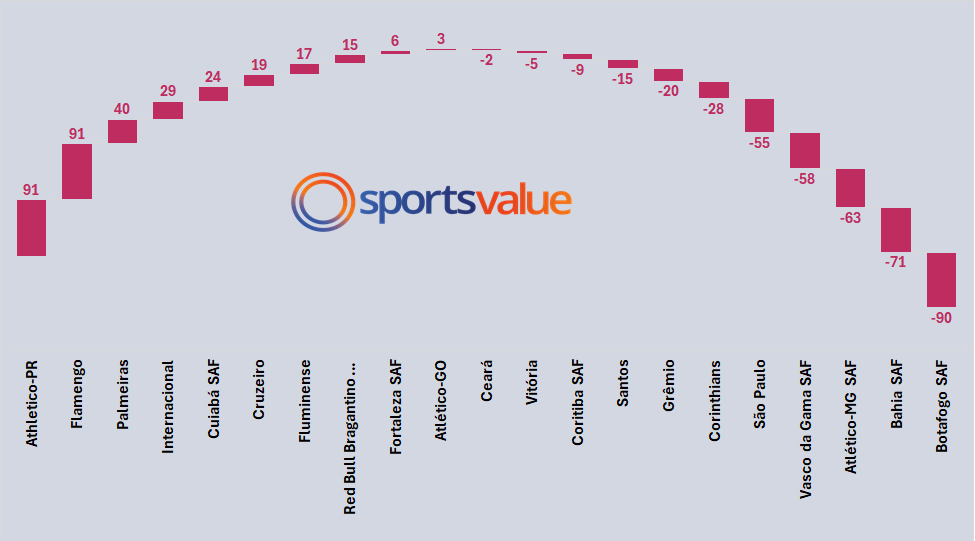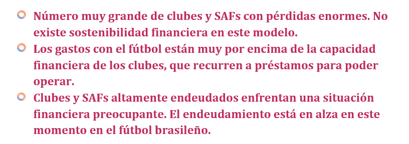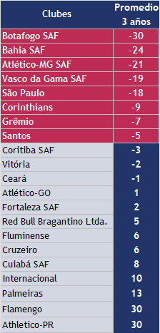 Botafogo SAF, Bahía SAF, Atlético-MG SAF, São Paulo, Vasco da Gama SAF, Corinthians, Santos y Grêmio, están con déficits promedio en los últimos 3 años por encima de US$ -4 millones.