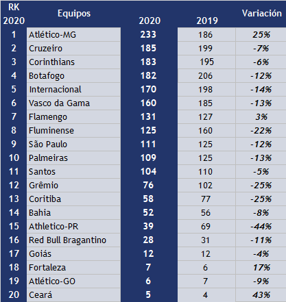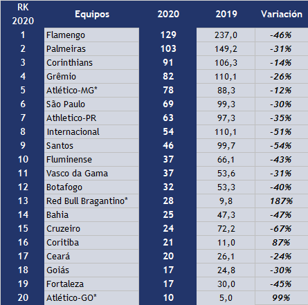 Flamengo sigue com lo más grande generador de ingresos, a pesar de que es el club el que más ha sufrido en valores absolutos de recortes de recursos en 2020.