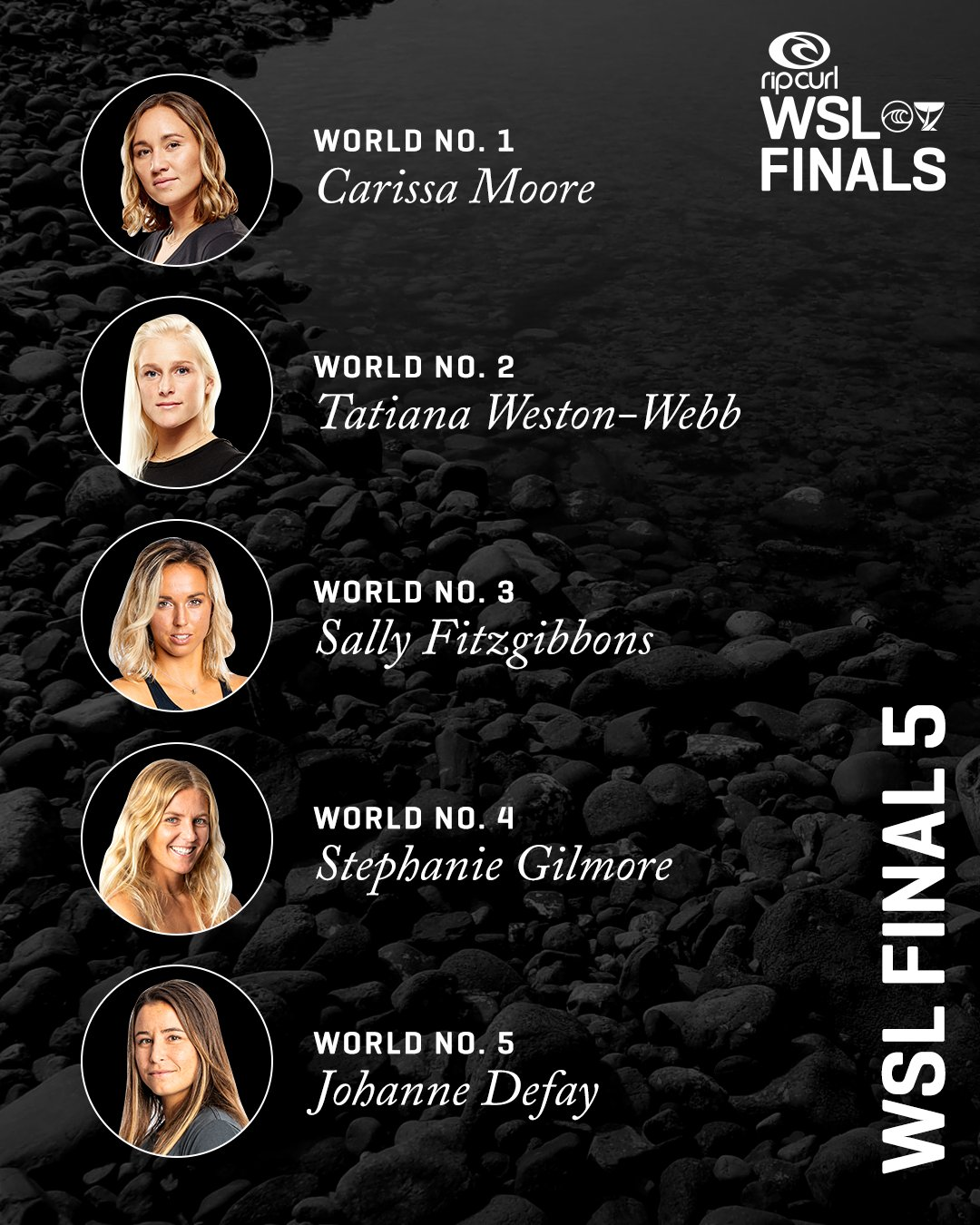 A WSL tem grandes ídolos do surfe feminino global como as australianas Stephanie Gilmore e Tyler Wright, a havaiana Carissa Moore, a francesa Johanne Defay, a brasileira Tatiana Weston-Webb e a costarriquenha Brisa Hennessy