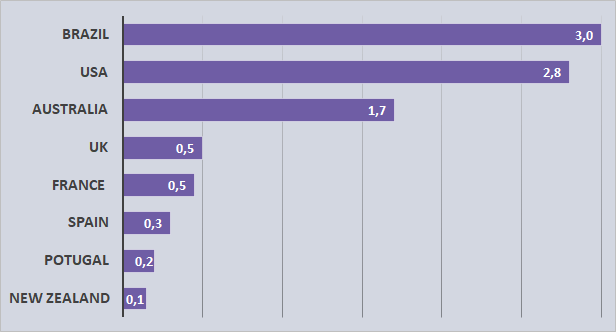 Praticantes de surfe- Por país- Em milhões