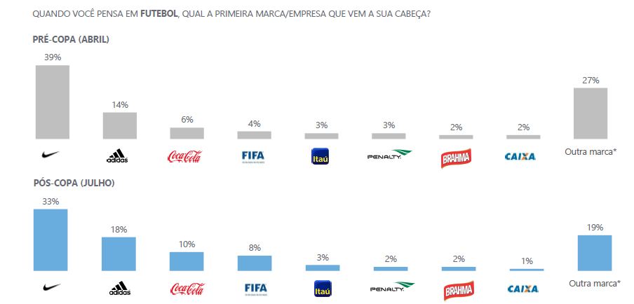 A Nike é a marca mais lembrada como patrocinador da Seleção Brasileira com 27% de reconhecimento. O Guaraná Antártica em segundo com apenas 7%, adidas que nem patrocinador é com 6%, o mesmo índice de Itaú e Coca Cola.