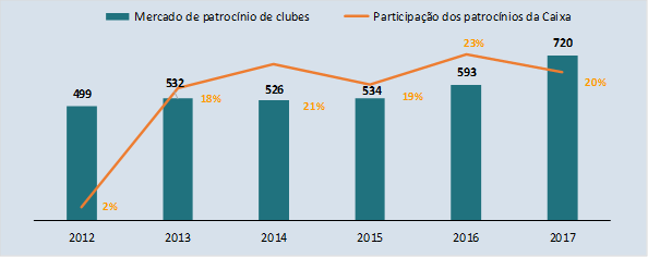 Em 2017, o mercado de patrocínios de clubes de futebol no Brasil somou R$ 720 milhões, sendo a Caixa responsável por R$ 146 milhões, ou 20% do total.