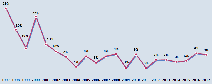 Crescimento das receitas dos times europeus de primeira divisão- 1997 a 2017