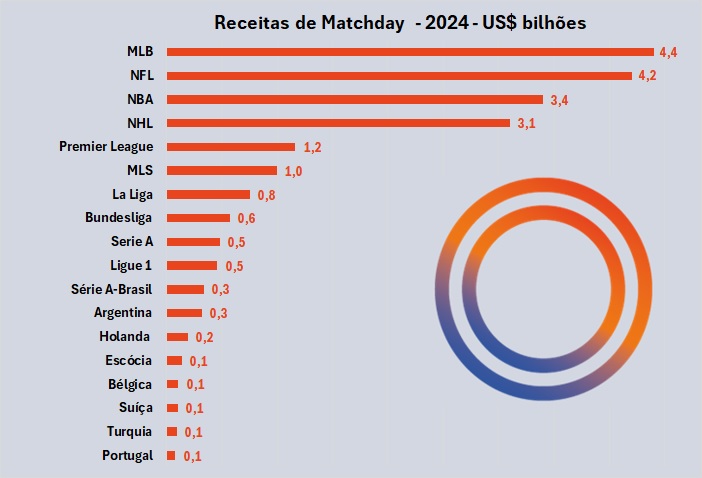 Ligas dos EUA dominam completamente o ranking, com destaque para a MLB, que gerou em 2024 US$ 4,4 bi em gameday. Times da liga de beisebol jogam 81 partidas em casa, o que faz da liga com mais torcedores nos estádios.