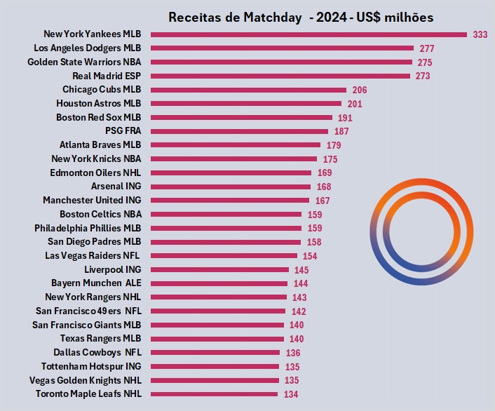 NY Yankees é disparado o time que mais gera receitas de matchday no mundo com US$ 333 milhões em 2024. O segundo colocado também é da MLB Los Angeles Dodgers com US$ 277 milhões.